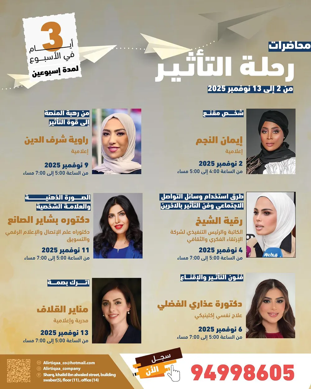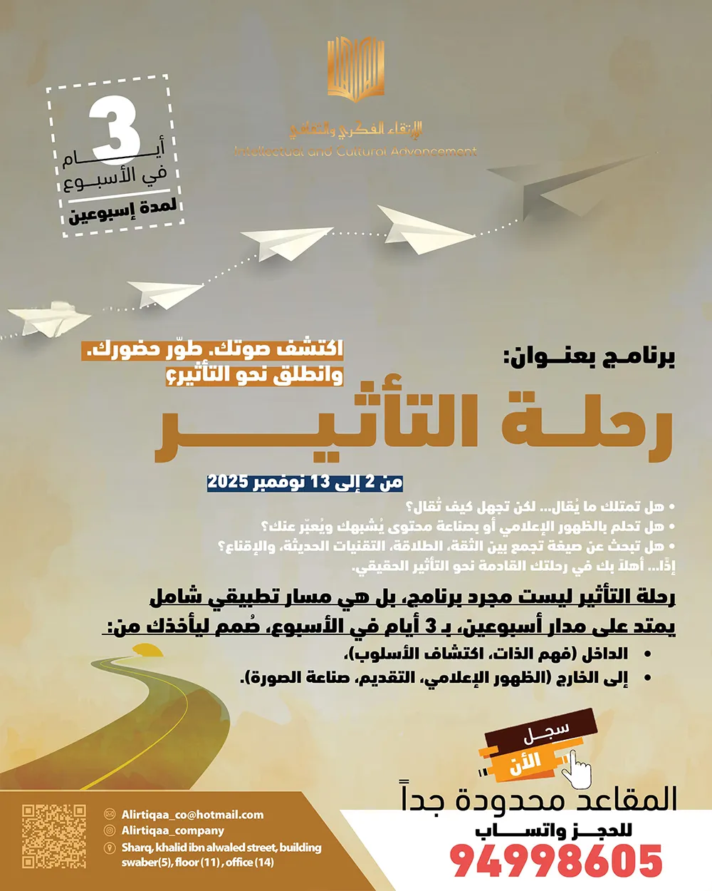 تأسست في دولة الكويت عام 2024، وهي شركة مرخّصة من وزارة التجارة والصناعة متخصصة في تنظيم المؤتمرات، الملتقيات، المعارض، الندوات، الدورات التدريبية، والاستشارات الفكرية والتسويقيه والثقافية. نؤمن أن الفكر هو جوهر النهضة، والثقافة هي قلب الحضارات النابض.